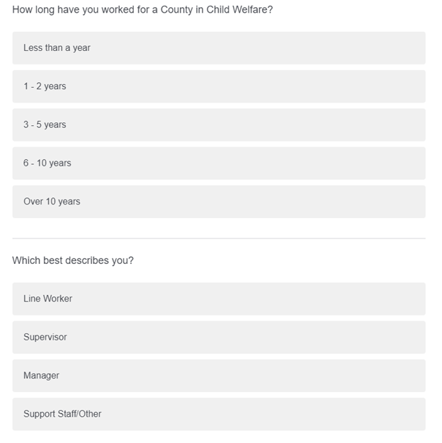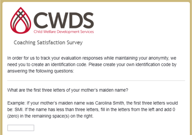 We are asking that you generate a unique identifier code to use every time you attend and complete a satisfaction survey for one of Child Welfare Development Services (CWDS) workforce development deliveries. By doing this we will be able gather more data and potentially triangulate and connect that data in the future. This unique identifier will not be linked to any name or email through CWDS and therefore none of the data can be connected to a specific person but the data for that unique identifier will be linked as you move from workforce development delivery to another. Your participation is voluntary and much appreciated as this will allow us to observe patterns in learning and development that will inform how we can improve our services or how counties can enhance training and development for their employees.