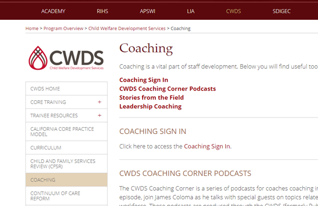 Step 3: From the CWDS Home Page go to the left column and choose “coaching”.