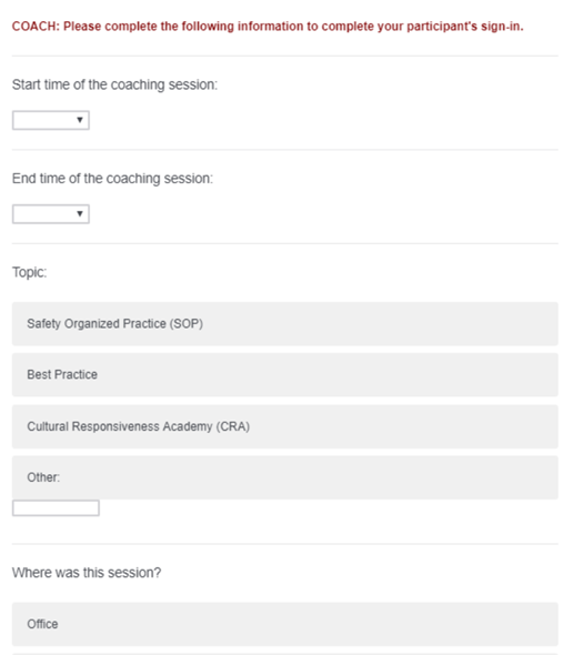 Step 2: This will take you to the second page where you will fill out information. In this section you will choose the start and end time of the coaching session. The times are rounded up and down to the nearest hour or half an hour. You will choose the larger topic (most will be SOP). Last you will choose where the coaching session took place: Office, Telephone or Field (Please check with the PC Manager or County Consultant before doing Telephone coaching to ensure that your county contract allows it. When you are done with this page you will click the red arrow button on the bottom right corner of the page to move to the next page.